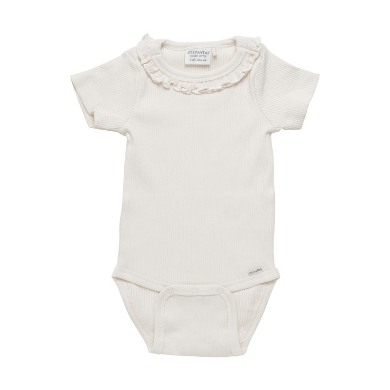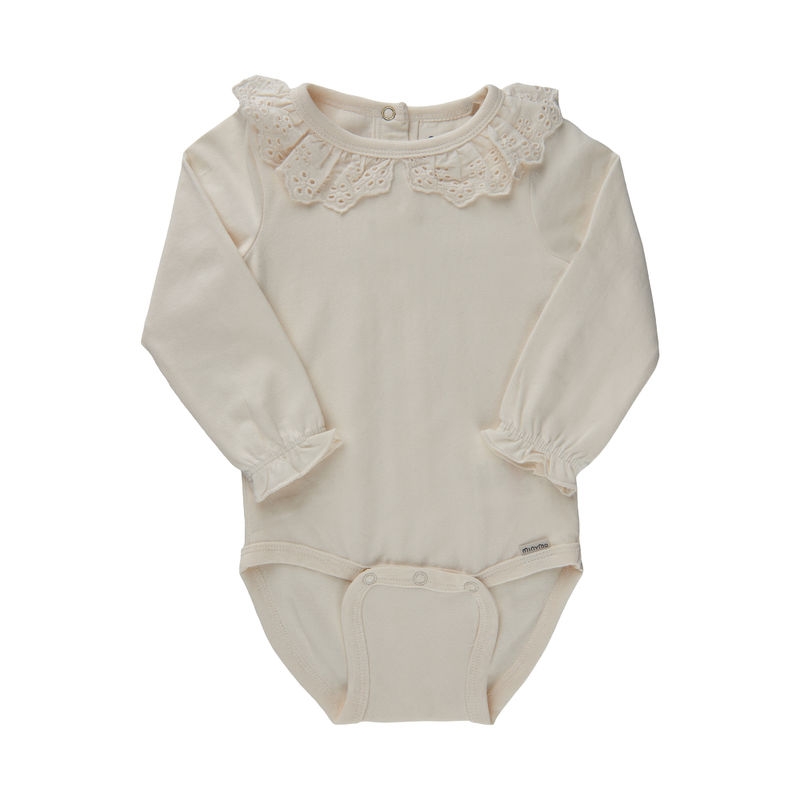 Søt body fra Minymo med en fin broderi anglaise krage. Bodyen er laget i strekkbar økologisk bomull og er veldig behagelig for barnet å ha på. Perfekt til festantrekket.