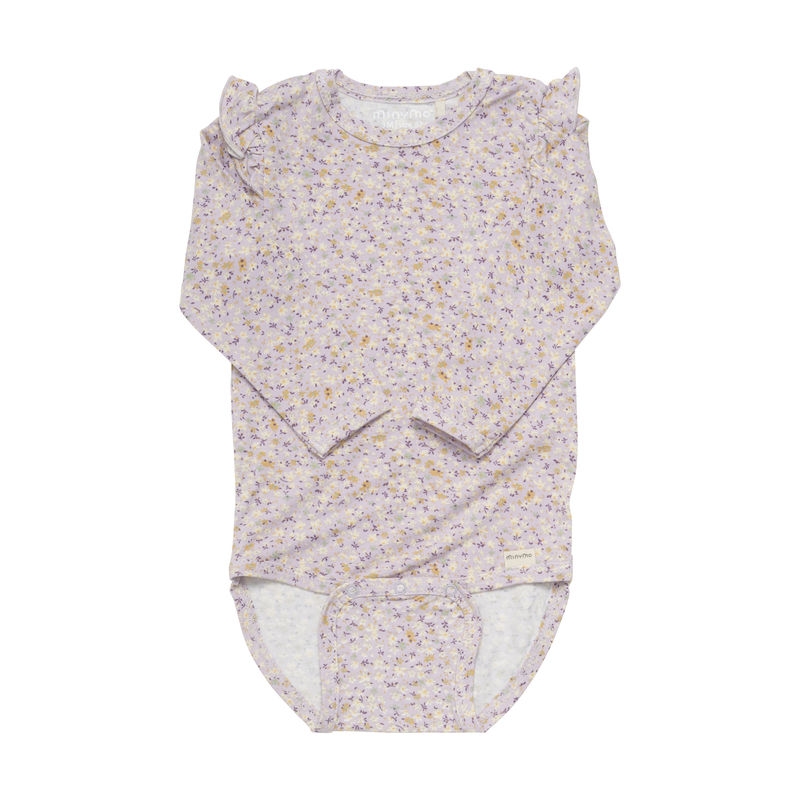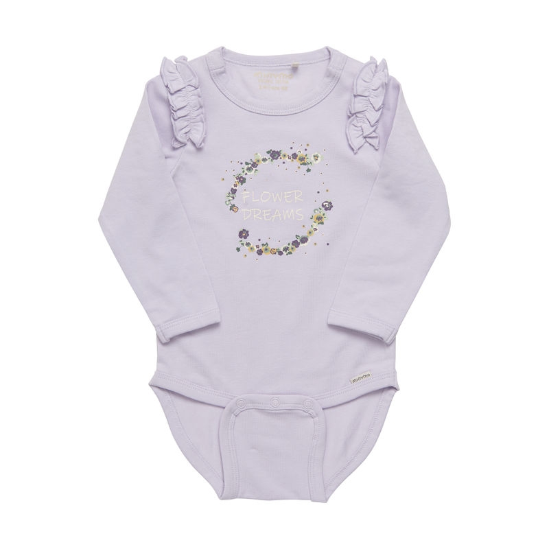 Søt body fra Minymo i en nydelig høstfarge med langer ermer, helprint og volanger på brystet.