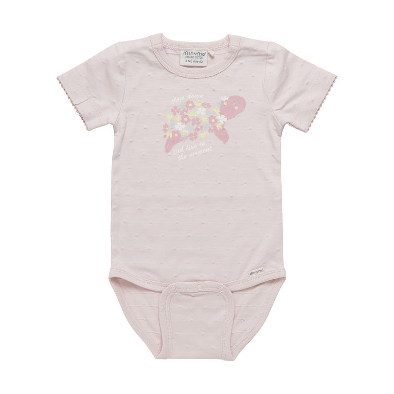 Fin body fra Minymo med et søtt print på brystet og volanger på skuldrene. Bodyen er laget av myk økologisk bomull.
