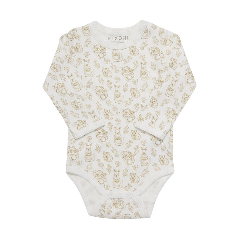 Body fra Fixoni med lang arm og et søtt helprint. Bodyen er laget av økologisk bomull og er sertifisert ihht. STANDARD 100 by OEKO-TEX®