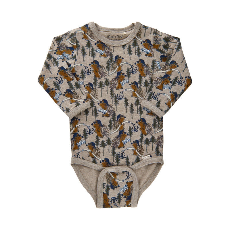 Minymo Body Baby Langermet Skogsdyrprint Beige Melange