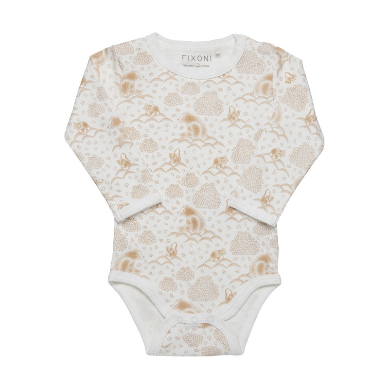 Body fra Fixoni med lang arm og et søtt helprint. Bodyen er laget av økologisk bomull og er sertifisert ihht. STANDARD 100 by OEKO-TEX®