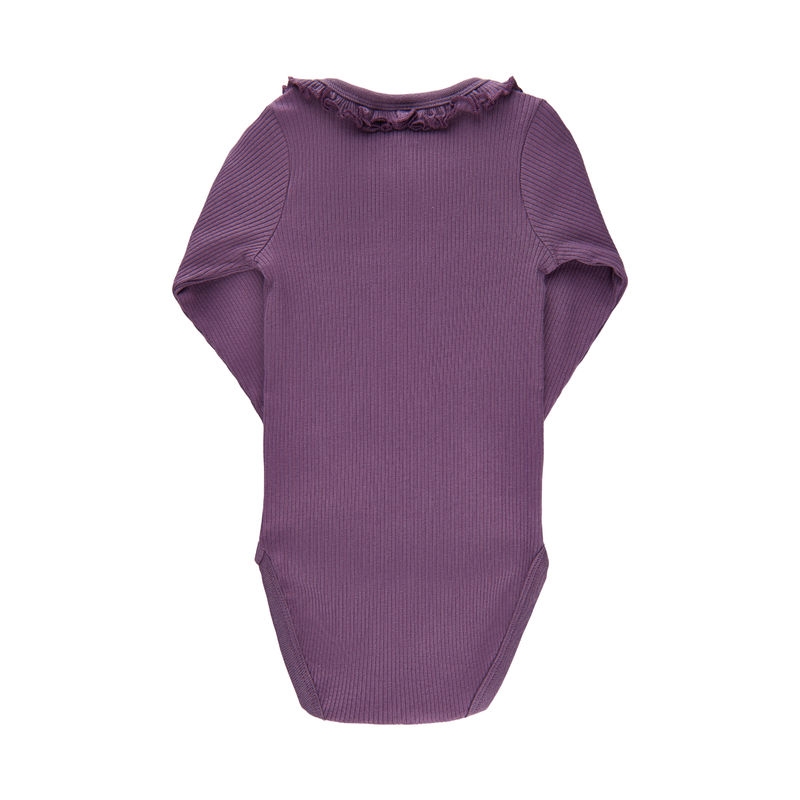 Søt rib body fra Minymo med volanger rundt halsen. Bodyen er laget av myk økologisk bomull.