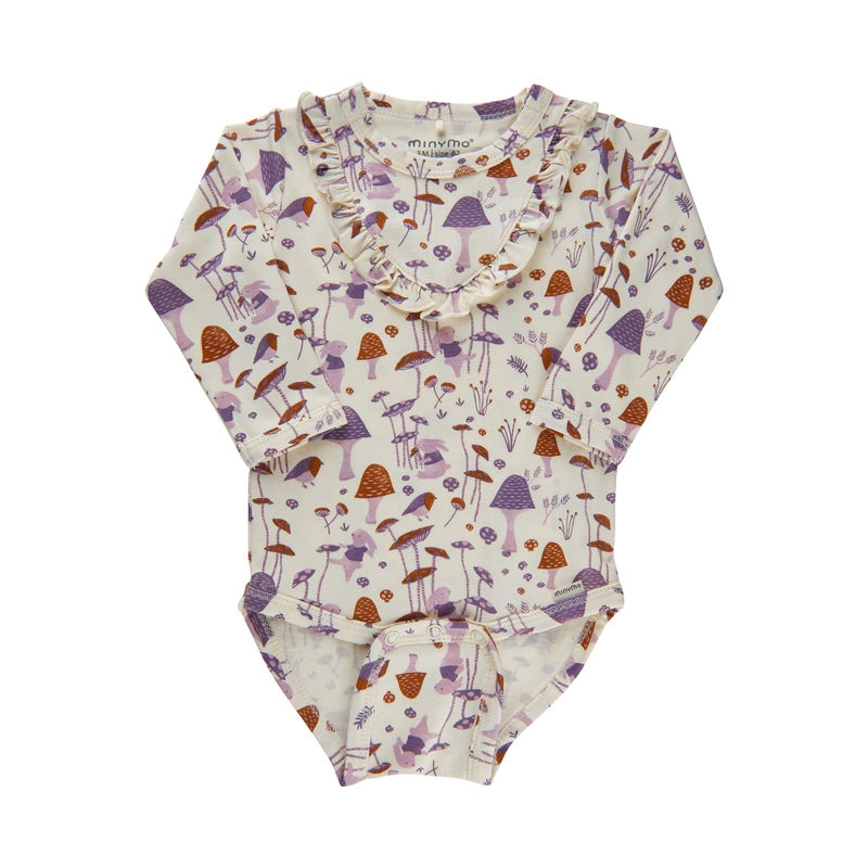 Nydelig body fra Minymo i supermyk bamusviskose. Bodyen har korte ermer, helprint av blomster og søte volanger på brystet. Det finnes også en drakt i samme design.