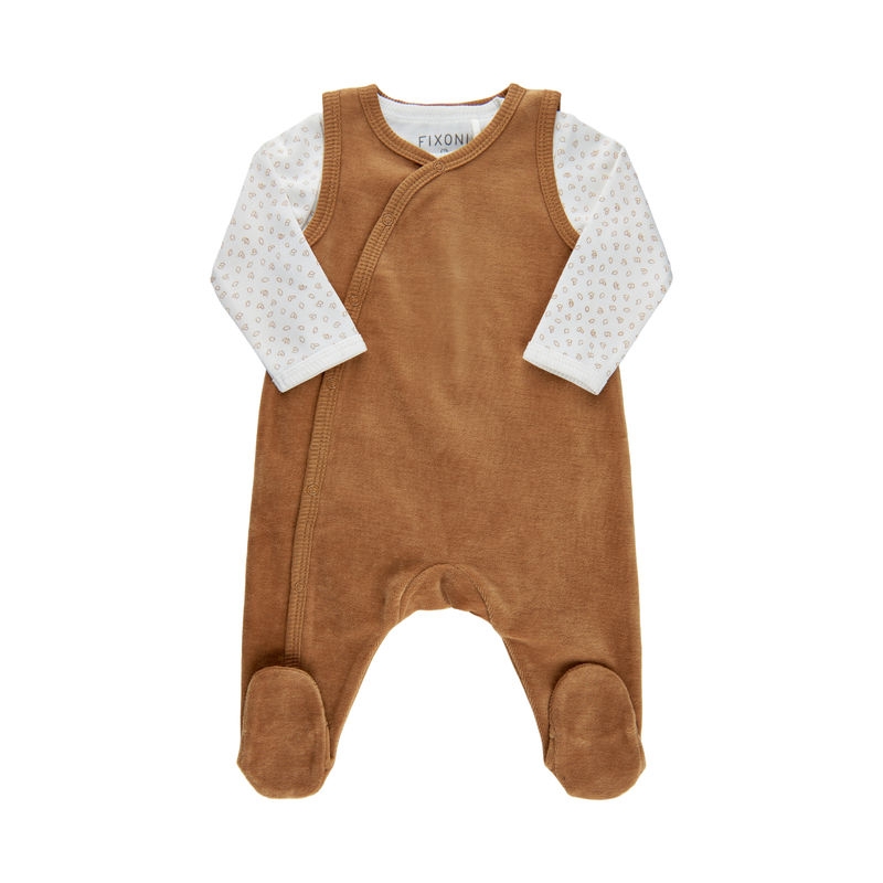 Søt omslags sparkebukse med tilhørende body i økologisk bomull fra Fixoni. Sparkebuksen er laget i myk velour og kommer i flere fine fargevarianter.