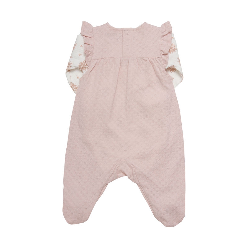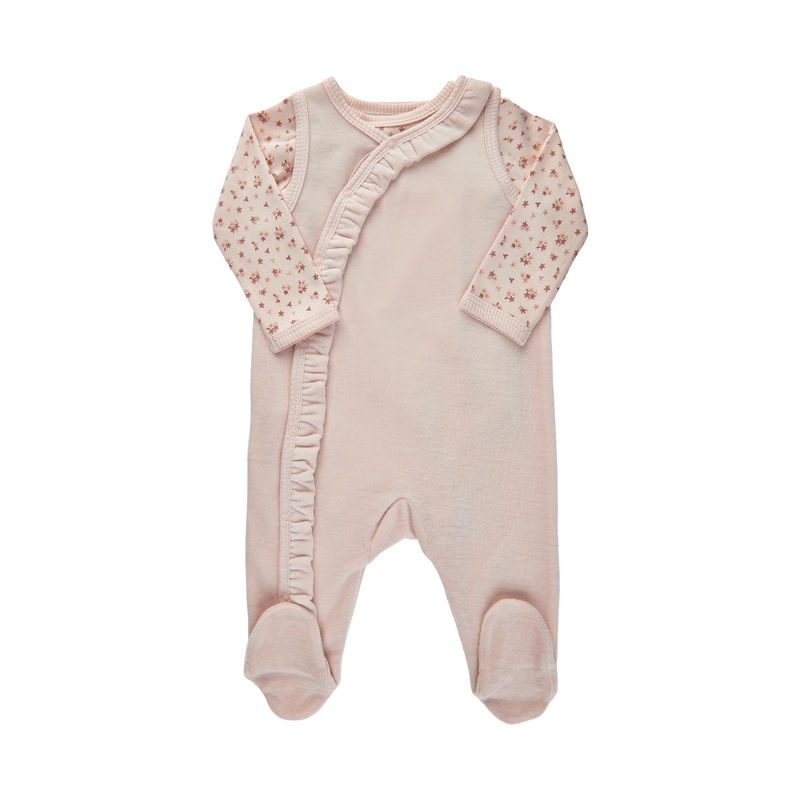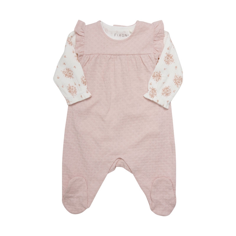 Nydelig sett fra Fixoni med langermet body og velour romper. Bodyen har blomsterprint og romperen er ensfarget med volanger på brystet. Begge er laget av økologisk bomull.