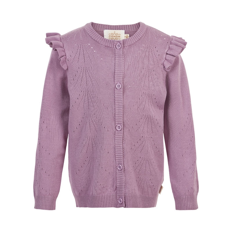 Søt cardigan fra Creamie i myk strikk med hullmønster og fine volanger ved håndleddene. Finnes i flere fine fargevarianter.