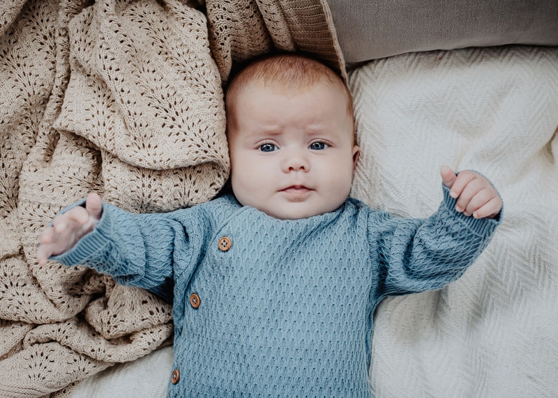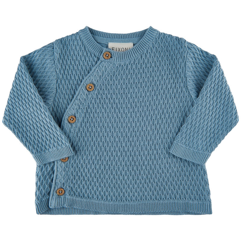 Søt strikket cardigan av myk økologisk bomull. Det finnes også en strikket bukse som passer til.