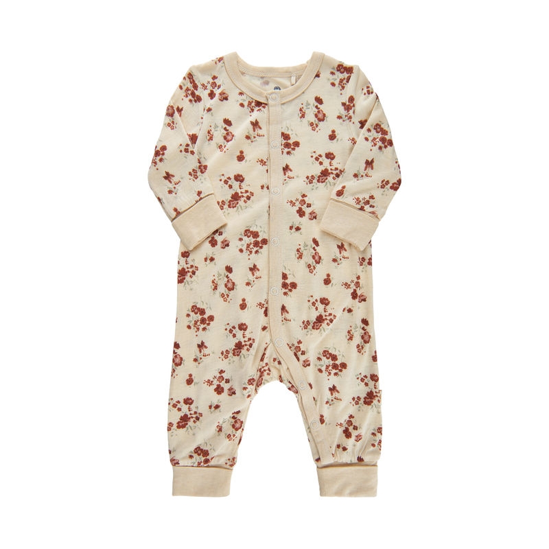 Nydelig og myk ulldrakt fra Celavi med blomsterprint. Drakten er laget av 100% ull på utsiden og 100% bambusviskose på innsiden så den er utrolig myk og god å ha på. Spesielt egnet for barn med sensitiv hud.